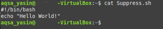 We can also display the contents of our Bash script file on the terminal by using the “cat” command. Before suppressing the output of the “cat” command, we would first like to show you its actual output. For that, you need to run the “cat” command as follows: