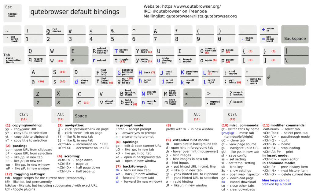 Qutebrowser is a free keyboard-focused browser with a simple and minimal interface. It is based on Python and PyQt5. It is available across multiple platforms such as Linux, Windows, and MacOS. The browser uses DuckDuckGo as the default search engine. Unlike traditional browsers that rely solely on mouse input for navigation, Qutebrowser provides a keyboard-focused navigation option as well where vim-style keybinds are assigned to particular commands. The image below shows the specified keybinds: