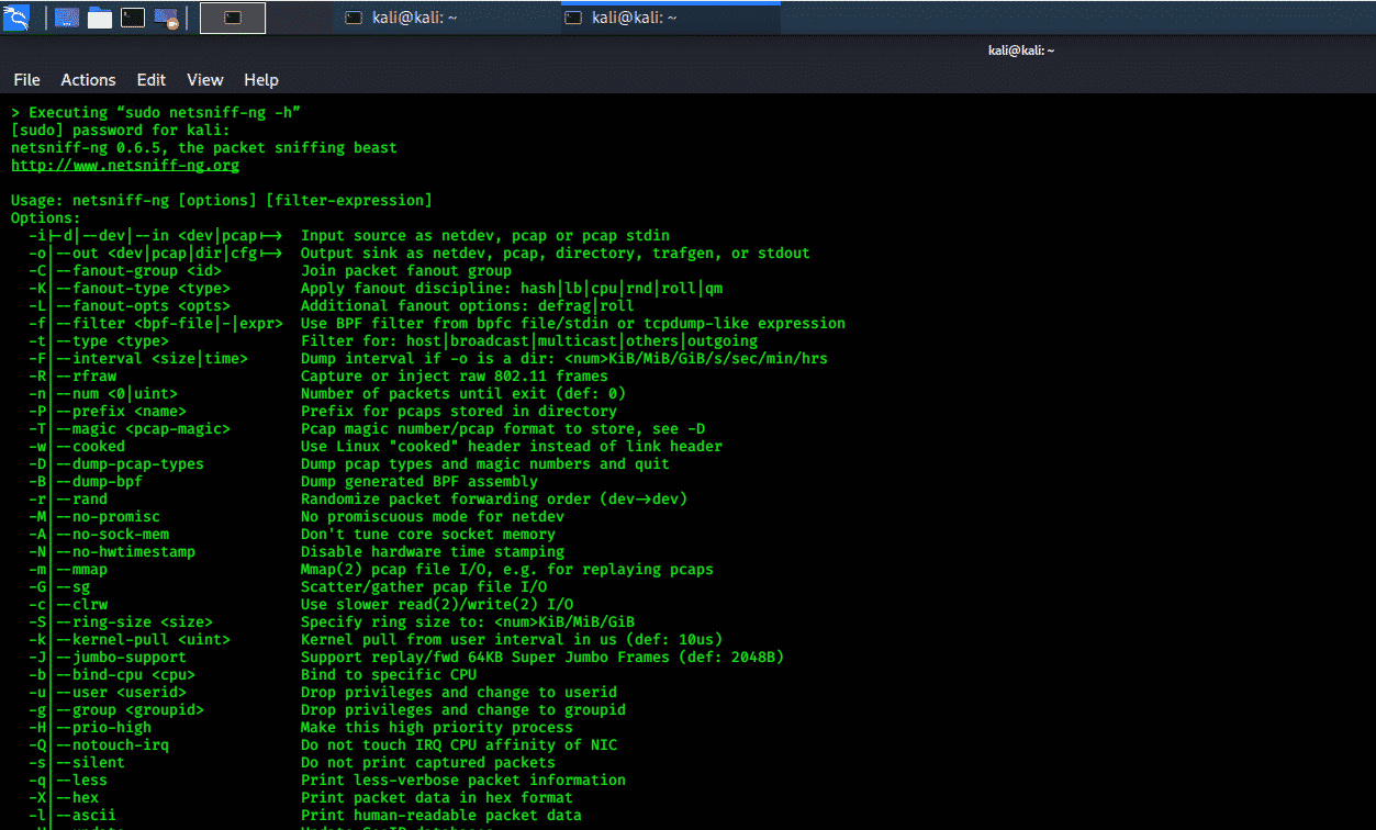The netsniff-ng tool is a fast, efficient, and freely available tool that can analyze packets in a network, capture and replay pcap files, and redirect traffic among different interfaces. These operations are all performed with zero-copy packet mechanisms. The transmission and reception functions do not require a kernel to copy packets to user space from kernel space and vice versa. This tool contains multiple sub-tools inside of it, such as trafgen, mausezahn, bpfc, ifpps, flowtop, curvetun, and astraceroute. Netsniff-ng supports multithreading, which is why this tool works so quickly.
