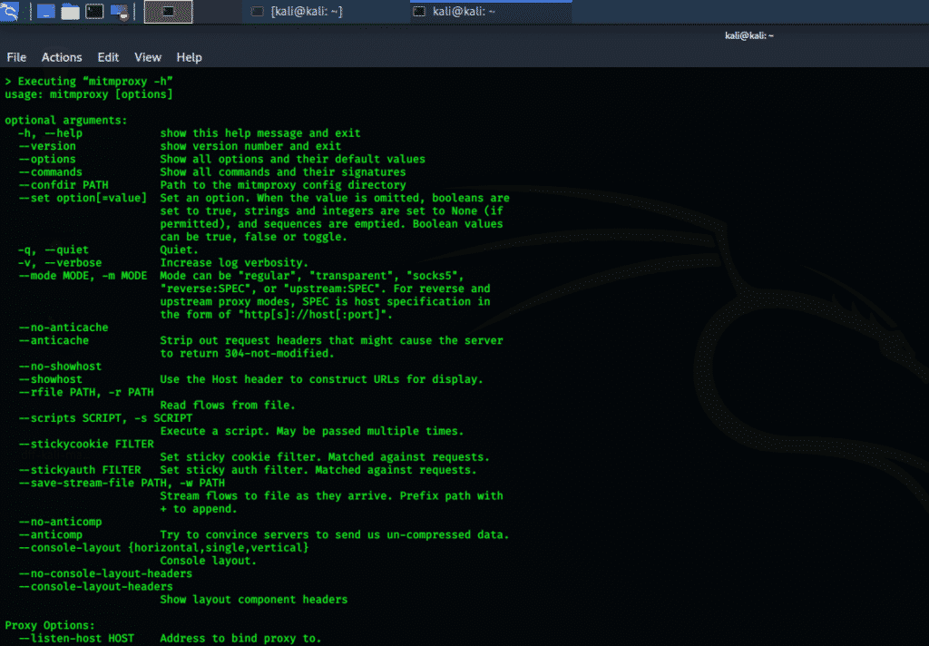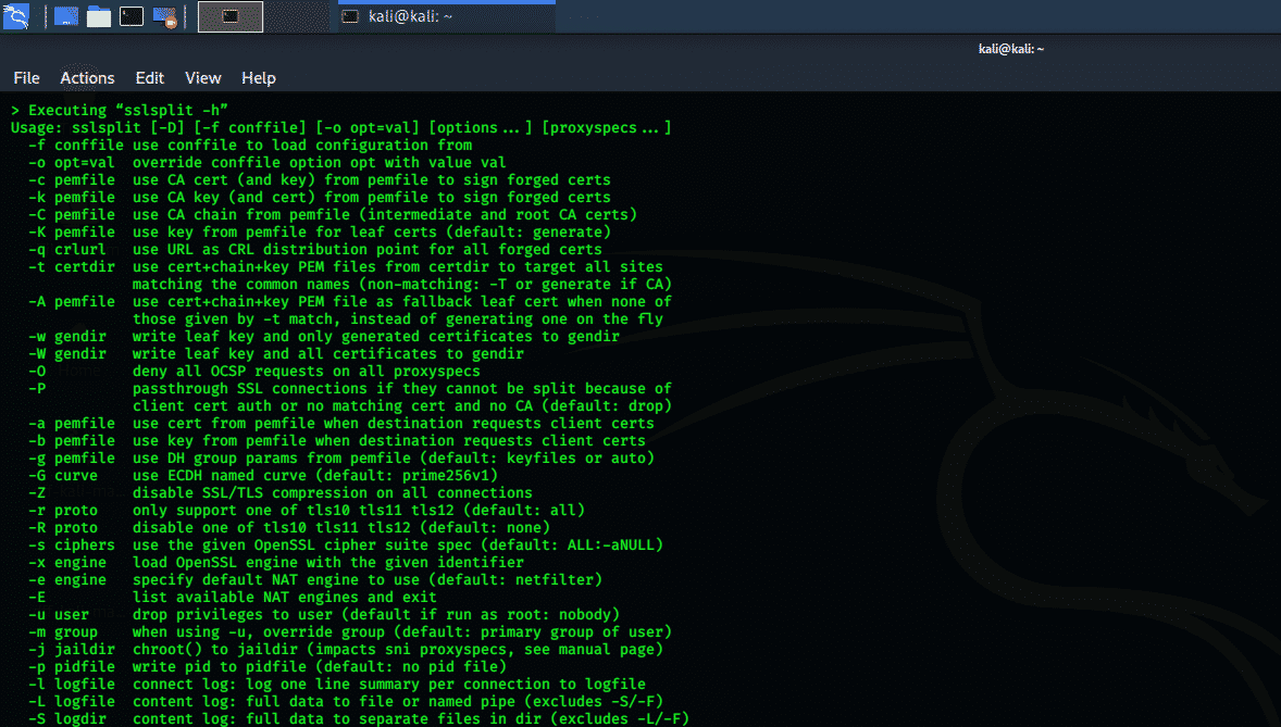 The sslsplit tool is a Kali Linux tool that acts against SSL/TLS encrypted network connections by using “man in the middle” (MIMT) attacks. All connections are intercepted through a network address translation engine. SSLsplit receives these connections and proceeds to terminate the SSL/TLS encrypted connections. Then, sslsplit originates a new connection to the source address and logs all the data transmissions.