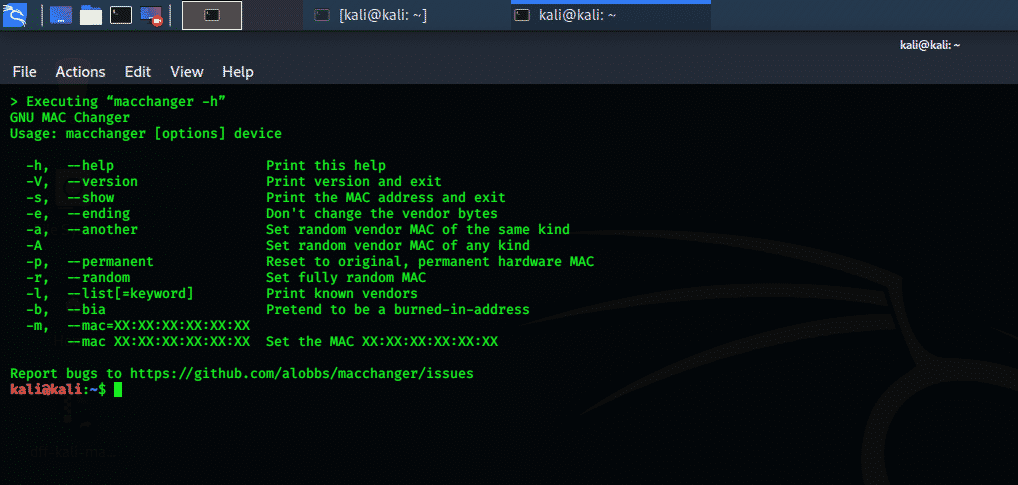 The macchanger tool is a favorite tool for pentesting in Kali Linux. Changing the MAC address is very important while pentesting a wireless network. The macchanger tool changes the attacker’s current MAC address temporarily. If the victim network has MAC filtering enabled, which filters unapproved MAC addresses, then macchanger is the best defensive option.