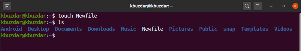 In the following example, we will create an empty file through the terminal with the name ‘Newfile.’ The touch command does not notify through a prompt when a new file is created. So, to verify new file creation, list the files using the ‘ls’ command.