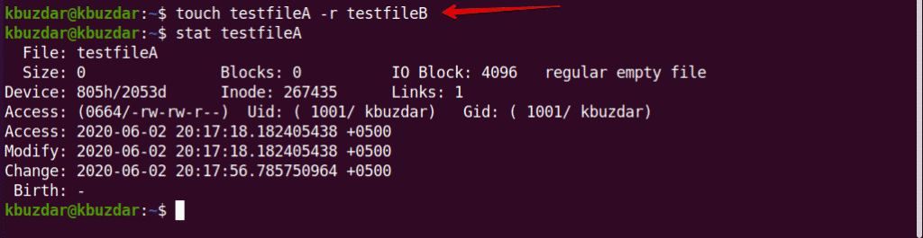 Here, we want to copy the access and modification times of testfileA to testfileB. To do so, execute the following touch command: