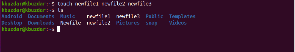 Using the touch command, we will create three files with three different names in the example given below: