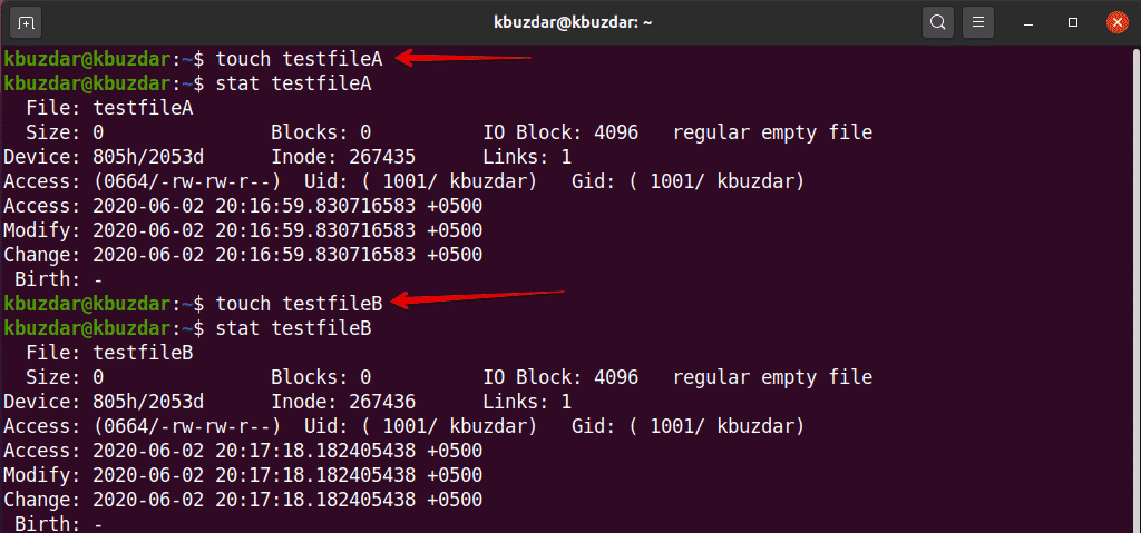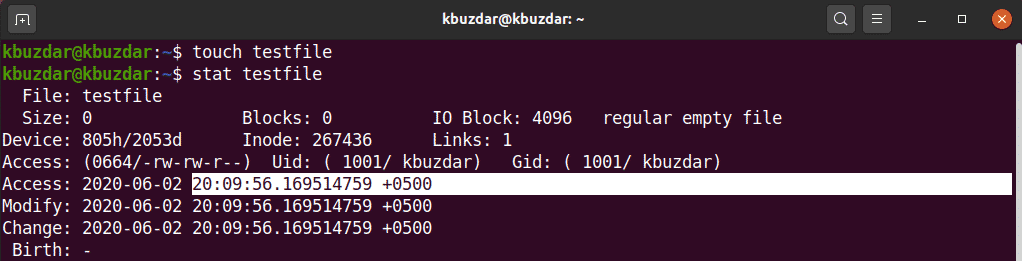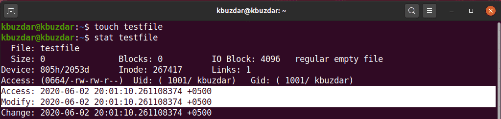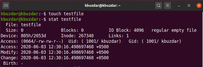 In this example, we will create a file named ‘testfile’ using the touch command. Next, we will display the file statistics using the ‘stat’ command.