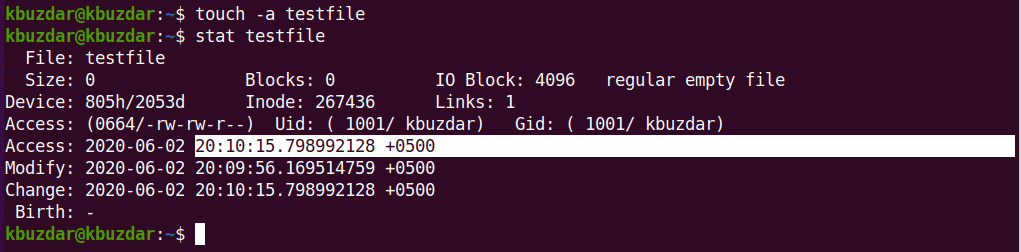In this example, we will create a file named ‘testfile’ using the touch command with the ‘-a’ option and then print the file statistics using the stat command, as follows: