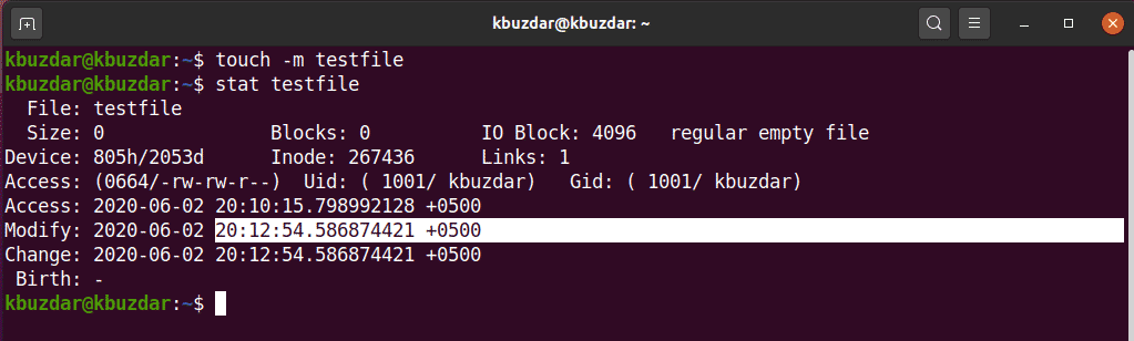 Similarly, you may use the touch command to change the modification time of an existing file using the ‘-m’ option, as follows: