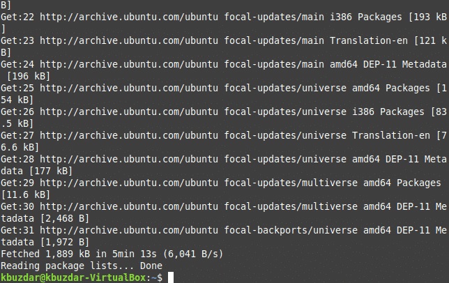 - The above command will take a sufficient amount of time to execute, depending on the frequency of usage of that command. It means that if you have used this command recently, then it will take a shorter amount of time to execute, as most of the packages would already have been updated. However, in my case, since I was running this command for the first time in Linux Mint 20, that is why it took a reasonably long time to complete. The execution speed also depends on your Internet connection. Once this command has been executed successfully, you will be able to see the following output in your terminal window: