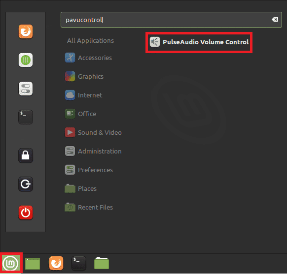 - Now, restart your Linux Mint 20 system to ensure that the newly-made changes have taken effect. Click on the Menu icon located at the bottom-left corner of your desktop, and then type ‘pavucontrol’ in the search bar. Then, select the ‘PulseAudio Volume Control’ search result, as highlighted in the image below: