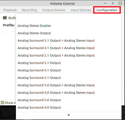 - When you click on it, the Volume Control window will appear on your screen. Switch to the ‘Configuration’ tab and then choose the profile from the dropdown list that represents your audio device, as shown in the following image:
