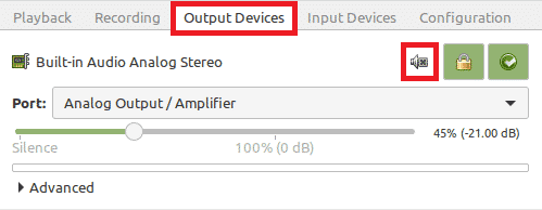 - Finally, switch to the ‘Output Devices’ tab and then unmute your audio device by clicking on the icon highlighted in the image shown below. If this icon is green by default, then it means that your audio device has been muted, and if it is grey, then your audio device has been unmuted, as shown in the image below: