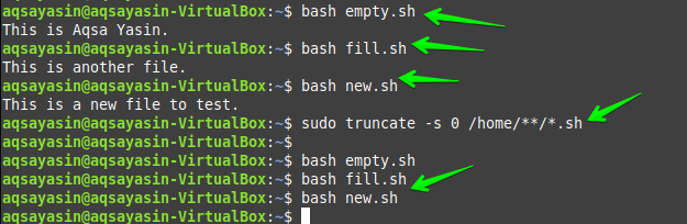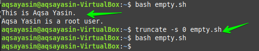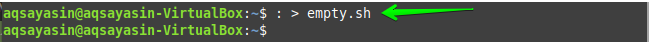 Another different way to remove the contents of a file is using the “truncate” command. The file “empty.sh” has been used here again with the same text script.