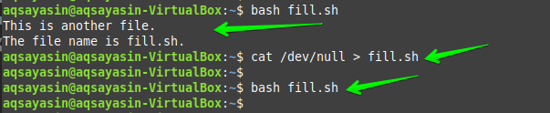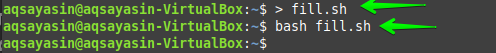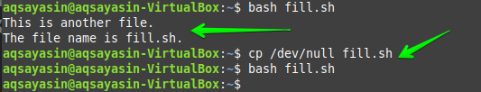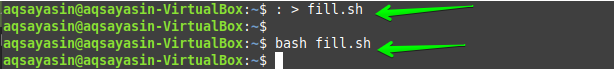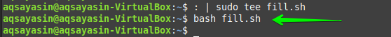 Another way of using the “sudo” command to make the file null is by using it along with the “tee” keyword. Therefore, use the file “fill.sh” again with the same contents in it.