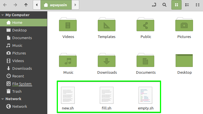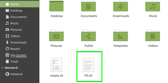 Now, the file “fill.sh” is present in the home directory, as shown in the image.