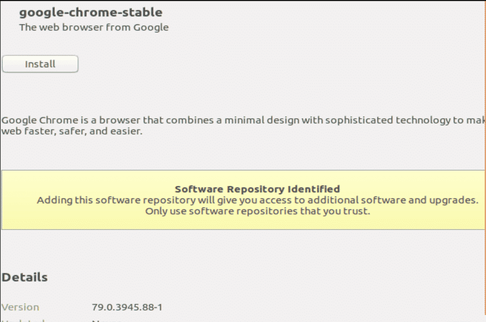 Go to the download directory and open the downloaded Chrome package. It will open in the Ubuntu Software Center for installation. Click on the install button, and Google Chrome will install via the software center.