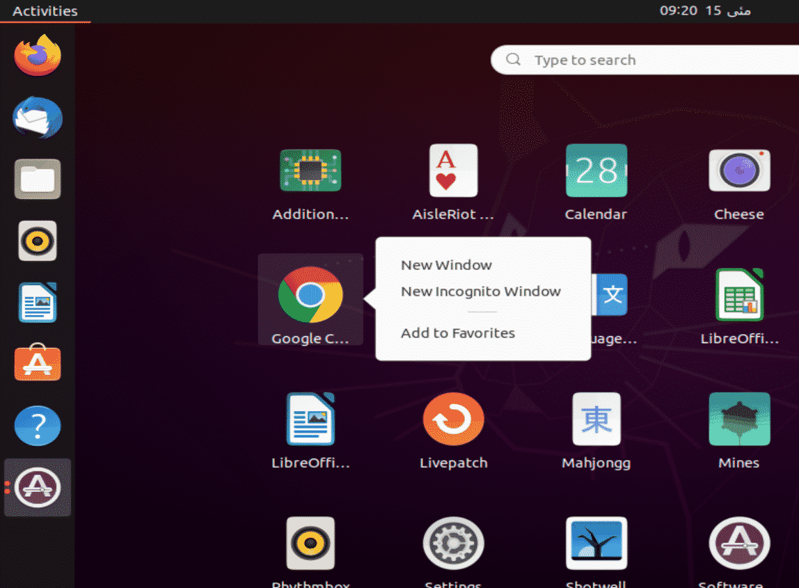 Go to the Activities menu and launch Google Chrome from there. You can also add it to your favorites bar by right-clicking it and selecting the add to favorites option.