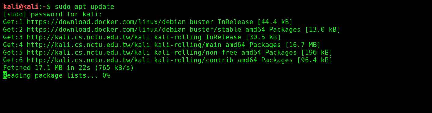You will first need to update the package indices list before you can update the Kali Linux system. To do so, enter the following syntax into the command terminal: