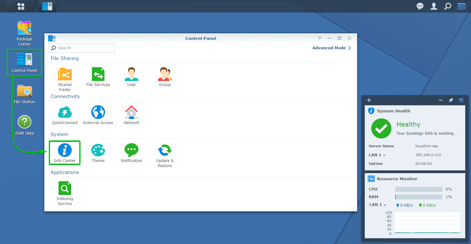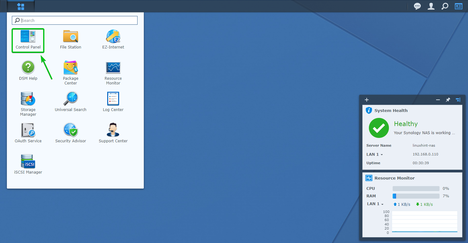 To check the memory, you’ve already installed on your NAS, open the Control Panel app from the Main Menu of Synology Web GUI, as shown in the screenshot below.