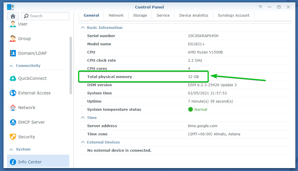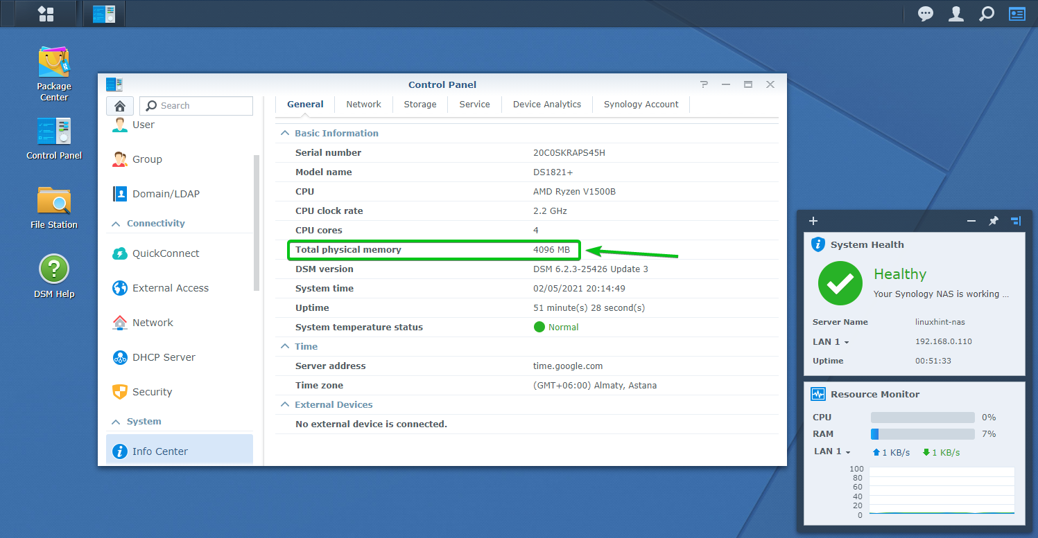 As you can see, 4096 MB or 4 GB of memory is installed on my Synology NAS model DS1821+.