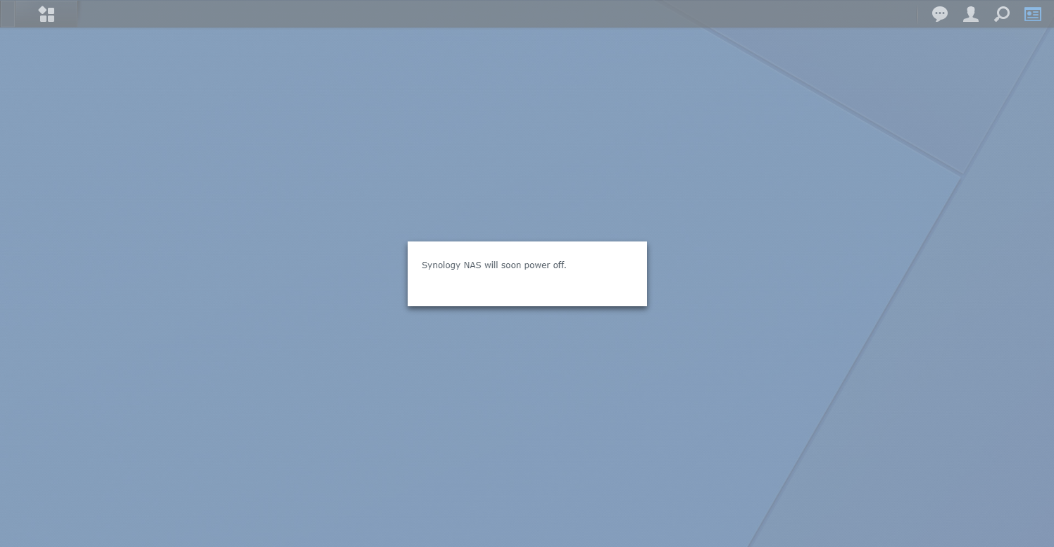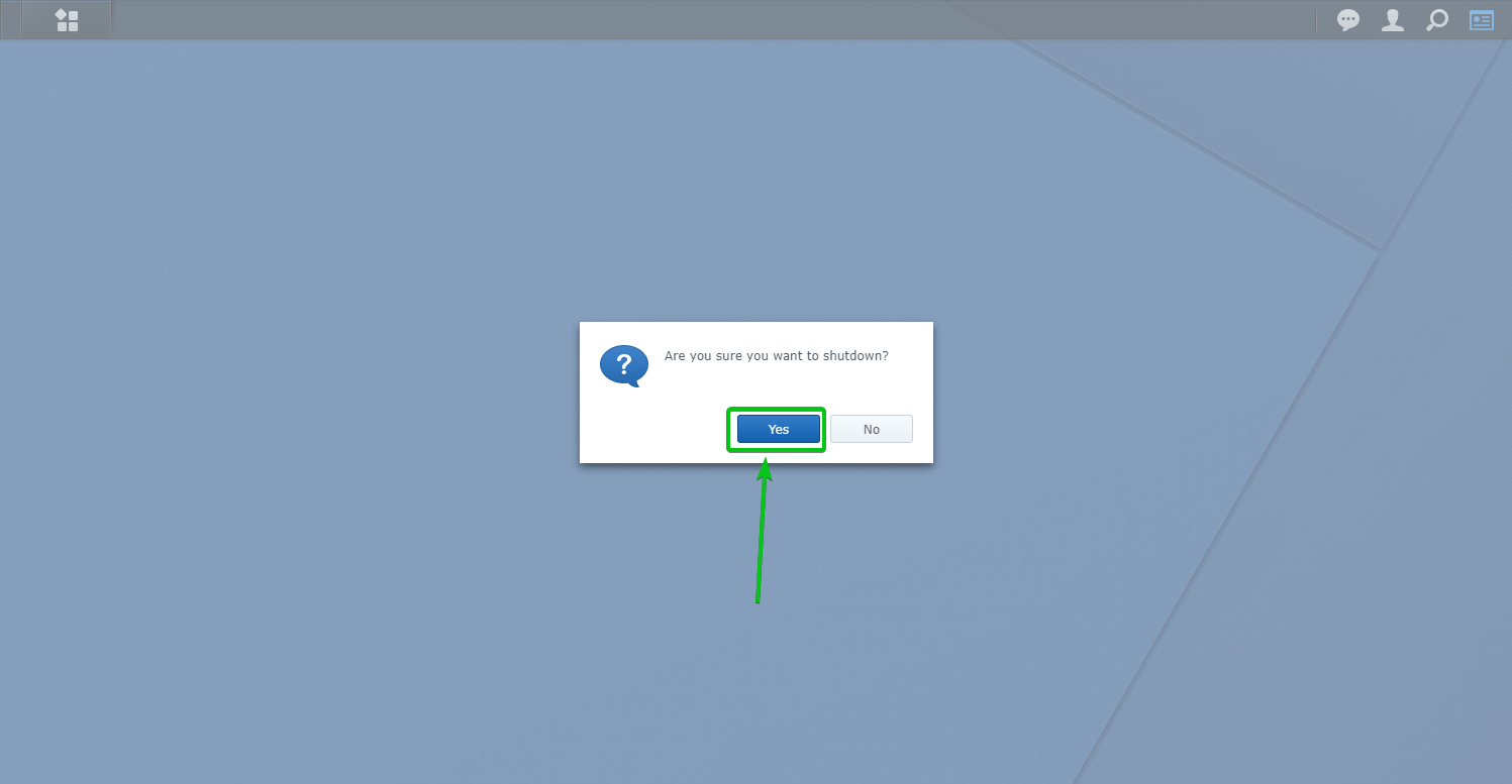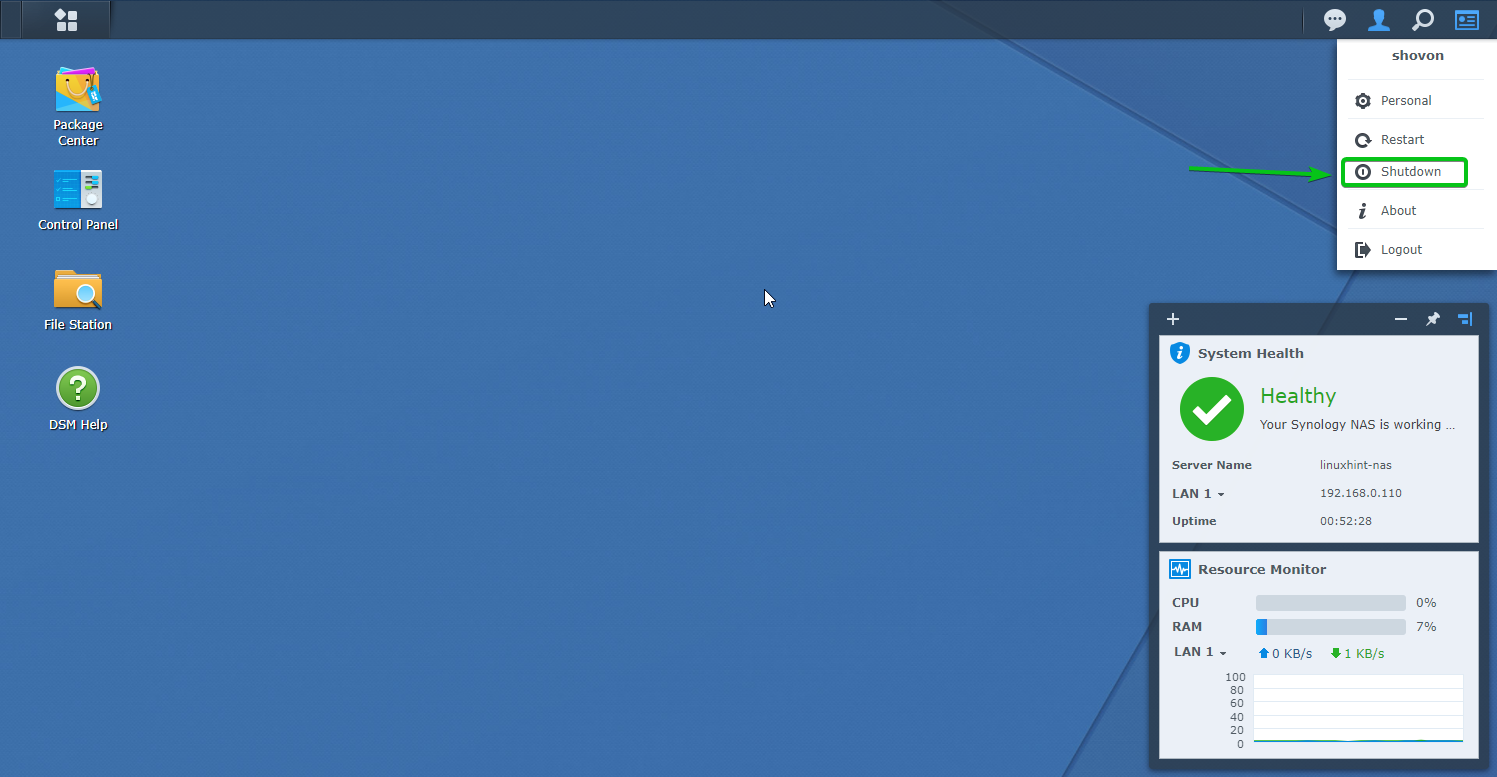 You can shut down the NAS from the Synology Web GUI. To do that, click on the user icon from the Synology Web GUI panel’s top-right corner and click on Shutdown, as shown in the screenshot below.