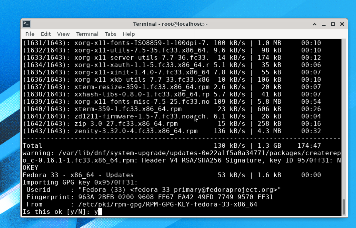 Step 3. In case of upgrading across three or more releases or upgrading from an old version of Fedora before Fedora 20, it may require you to import and install the package signing key. Otherwise, it is not required for upgrading across two releases or less from the version of Fedora 20 or later.