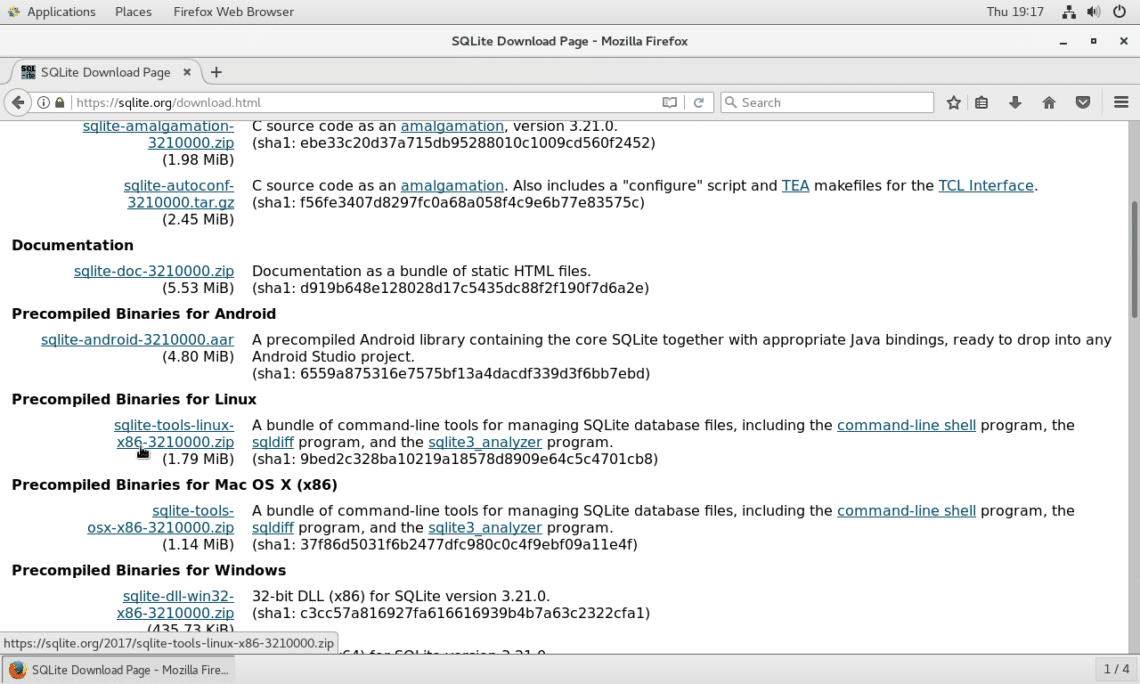 Now scroll down a little bit. You should see the section “Precompiled Binaries for Linux”. From here, you can download precompiled version of latest stable SQLite3 database. Precompiled binaries are ready to use after download, as they don’t require compilation of any sort. Click on the file as shown in the screenshot.