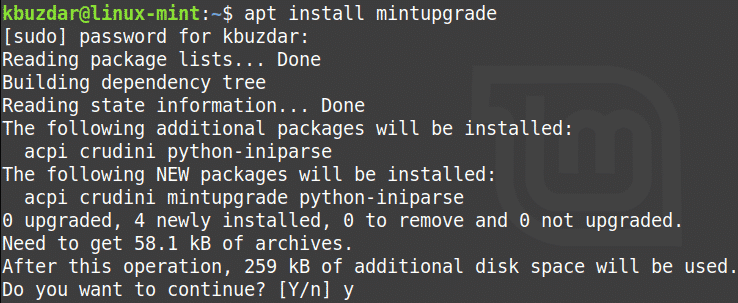 To upgrade Linux Mint from 19.3 to 20, you must first install the “Mintupgrade” command-line utility. Issue the following command in Terminal to install the Mintupgrade utility:
