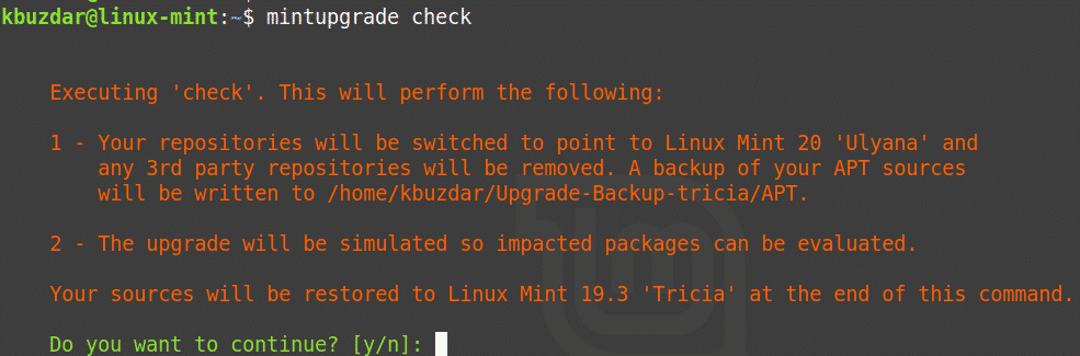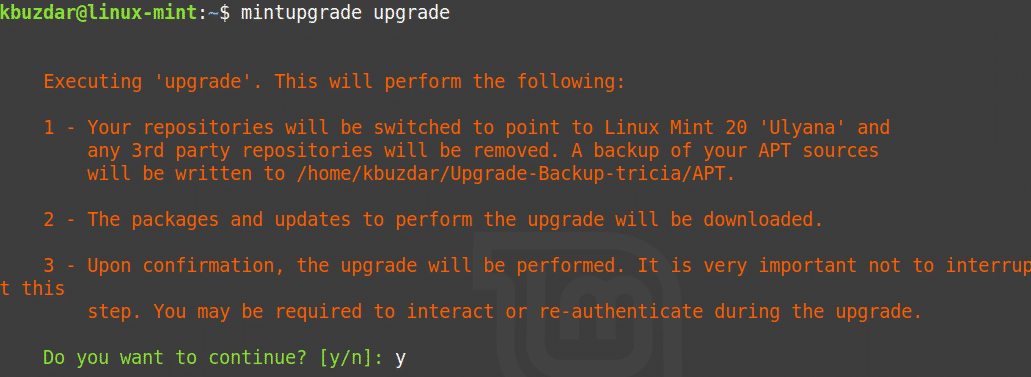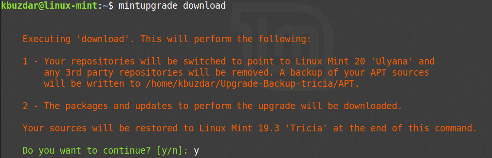 Now, you can finally upgrade to Linux Mint 20. Issue the following command in the Terminal to do upgrade your system: