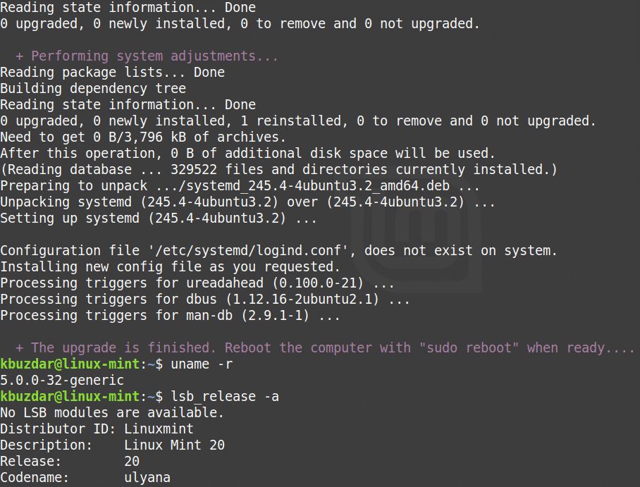 Wait patiently for this step to complete, as it will take some time to upgrade your Linux Mint 19.3 system to Linux Mint 20. Once the upgrade has completed, you can verify the upgrade by running the following command: