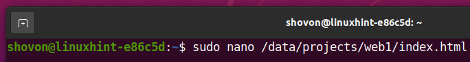 First, open the index.html file from the /data/projects/web1 subvolume with the nano text editor as follows: