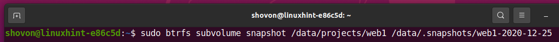 To take a snapshot of the /data/projects/web1 subvolume into the /data/.snapshots/web1-2020-12-25 directory (will be created automatically), run the following command: