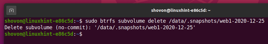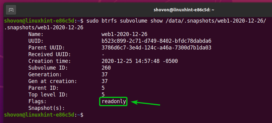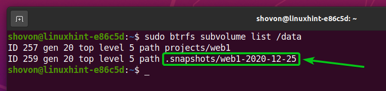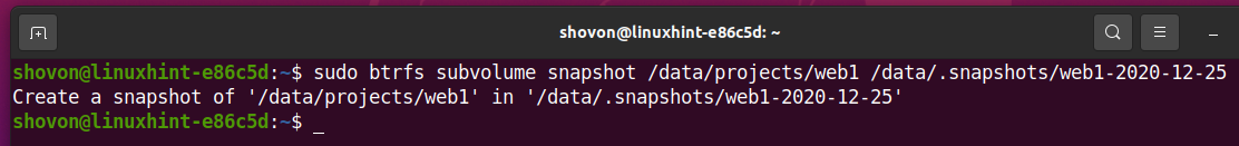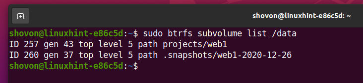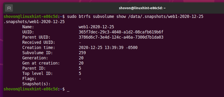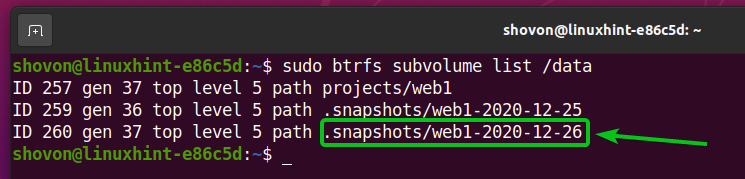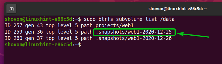 As you can see in the screenshot below, a new subvolume .snapshots/web1-2020-12-25 is created. A snapshot is actually a subvolume.