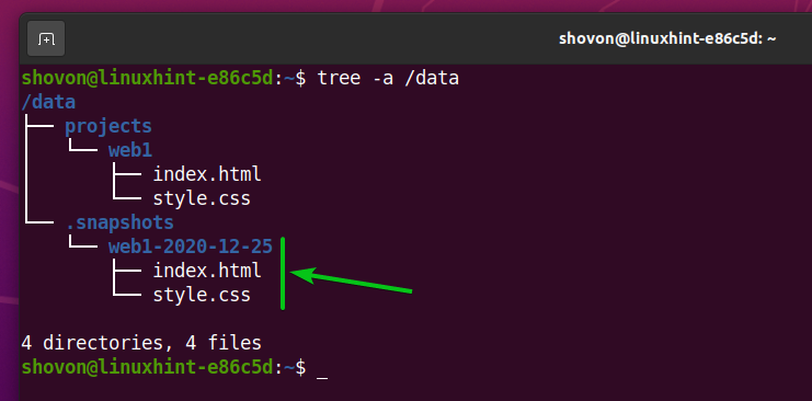 As you can see, all the files that are in the /data/projects/web1 subvolume are in the /data/.snapshots/web1-2020-12-25 snapshot.