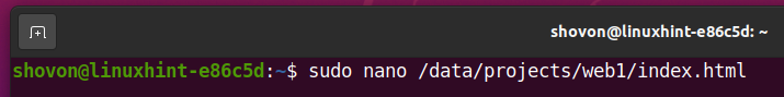 Open the /data/projects/web1/index.html file with the nano text editor as follows: