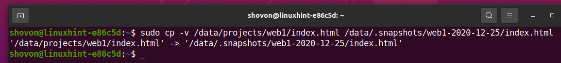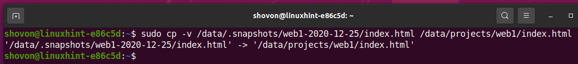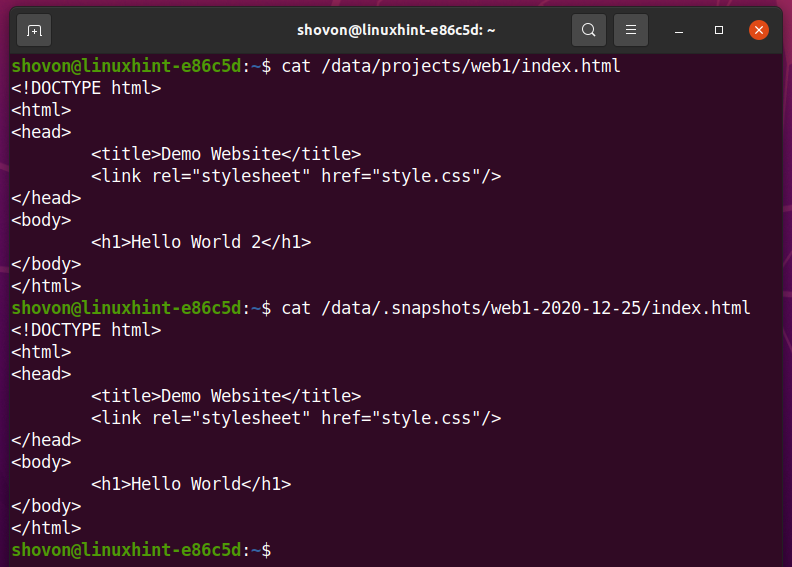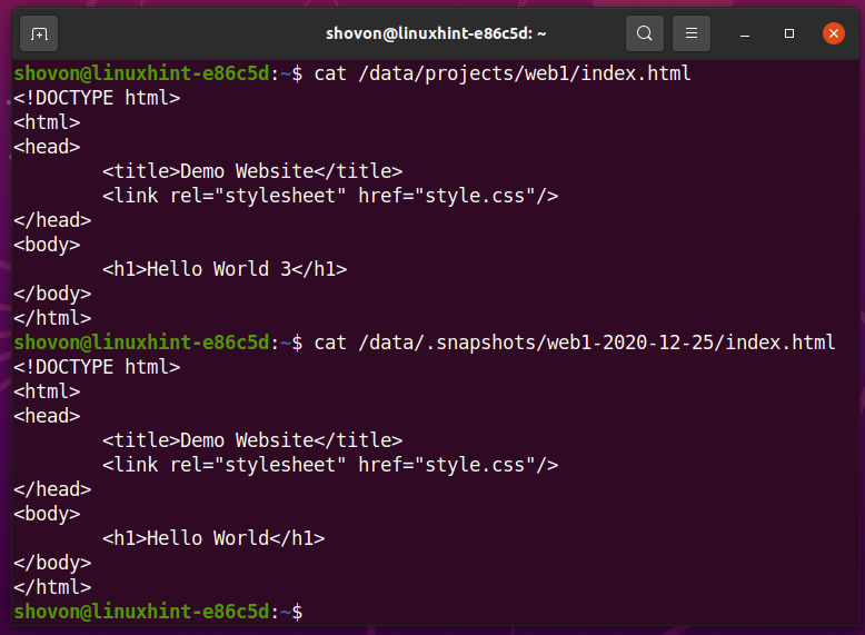 As you can see, the index.html in the /data/projects/web1 subvolume is different from the /data/.snapshots/web1-2020-12-26 snapshot.