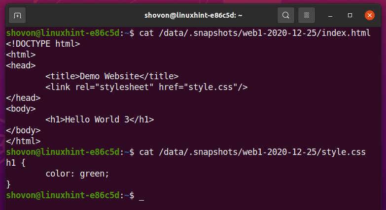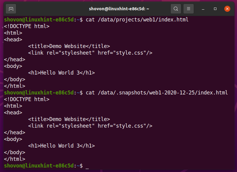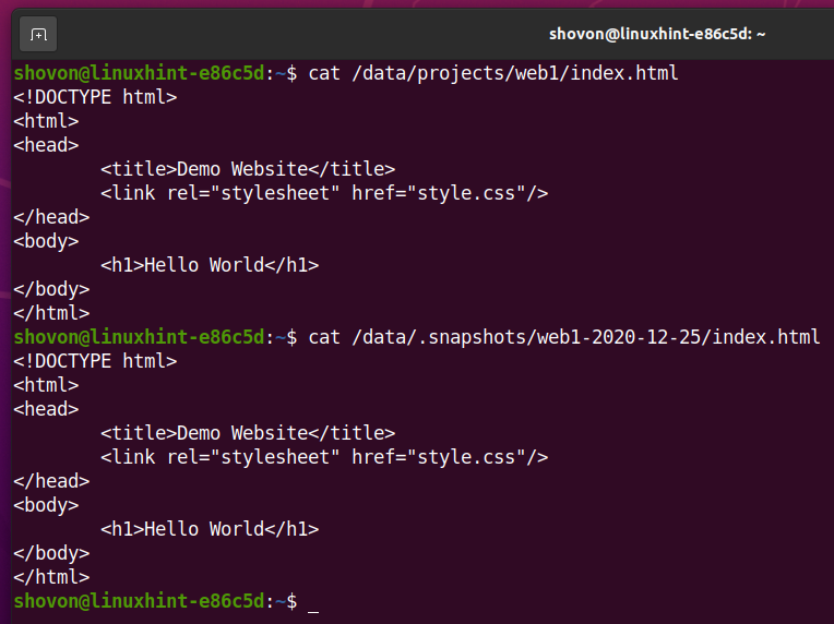 As you can see, the index.html file and style.css file contents are the same in the /data/projects/web1 subvolume and the /data/.snapshots/web1-2020-12-25 snapshot.