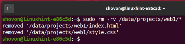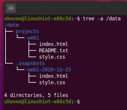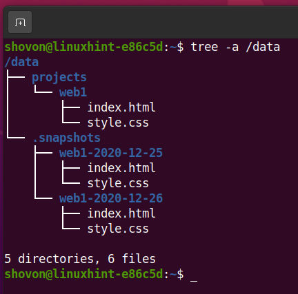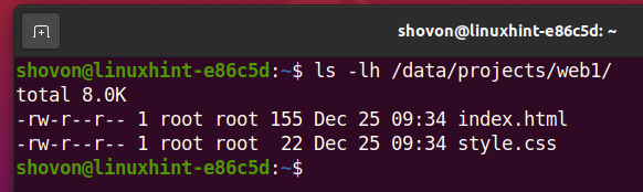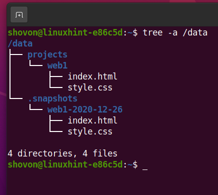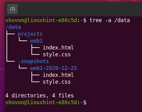 Now, the /data/projects/web1 subvolume has the index.html and style.css file.