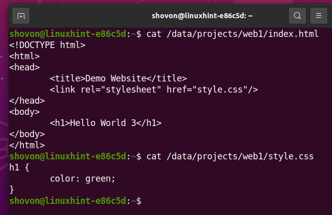 Contents of the index.html and style.css file in the /data/projects/web1 subvolume.