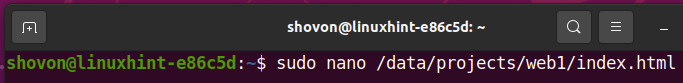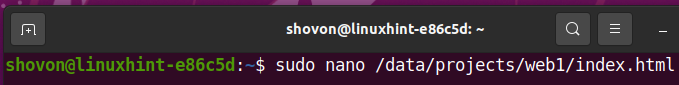 To do that, open the index.html file from the /data/projects/web1 subvolume with the nano text editor as follows: