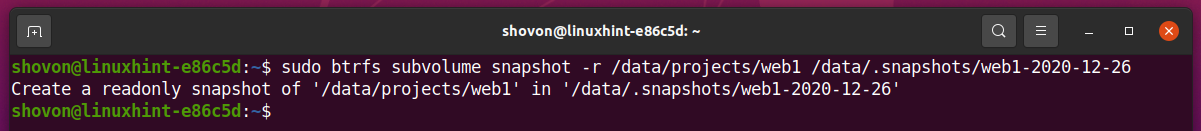 For example, to create a read-only snapshot /data/.snapshots/web1-2020-12-26 of the /data/projects/web1 subvolume, run the following command: