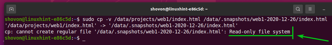 As you can see, you can’t update the index.html file of the /data/.snapshots/web1-2020-12-26 snapshot because the snapshot is read-only.