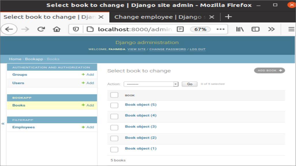 Modify the content of the admin.py file with the following content. Here, the Book class of the models is registered using the register() method to display the books tables in the Django administration dashboard.