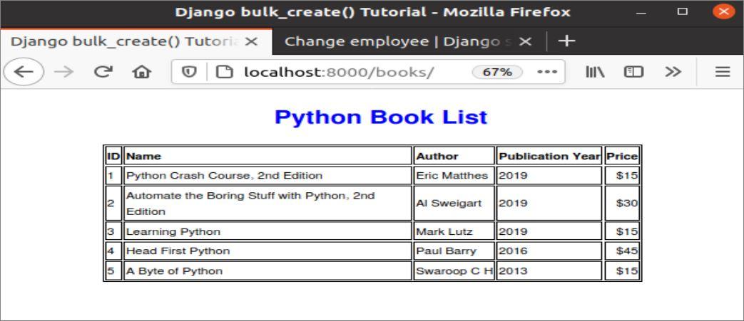 Modify the content of the views.py file with the following script. The model and template names are defined in the BulkInsert class. get_queryset() method of the class is defined in the script to return all records of the books table. On the other hand, Book.objects.all() method is used to return all records of the books table. exists() method is used in the script to check the books table is empty or not. If this method returns False then five records will be inserted into the books table using the bulk_create() method.