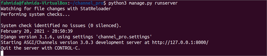 The following output will appear in the terminal after running the Django server. The output shows that ASGI/Channels version 3.0.3 is running.