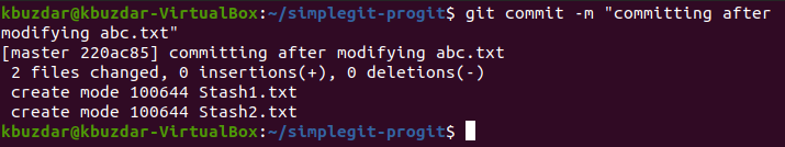 When this command will execute, you will notice that our two files that were uncommitted previously i.e. Stash1.txt and Stash2.txt will be committed.