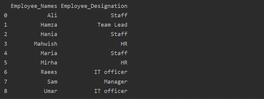 'Employee_Names':['Sam', 'Ali' , 'Umar', 'Raees', 'Mahwish', 'Hania', 'Mirha', 'Maria', 'Hamza'],