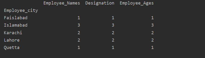 In this example, we have used a ‘count()’ function with groupby to count the Employees who belong to the same ‘Employee_city’.
