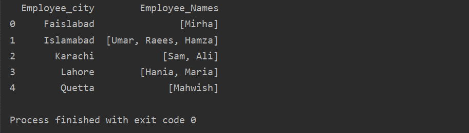 In this example, we have inserted similar records into the group list. All the employees are divided into the group based on ’Employee_city’, and then by applying the ‘Lambda’ function, this group is retrieved in the form of a list.