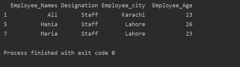 In the below-given example, we have group data based on ‘Designation’. Then, the ‘Staff’ group is retrieved by using the .getgroup(‘Staff’).