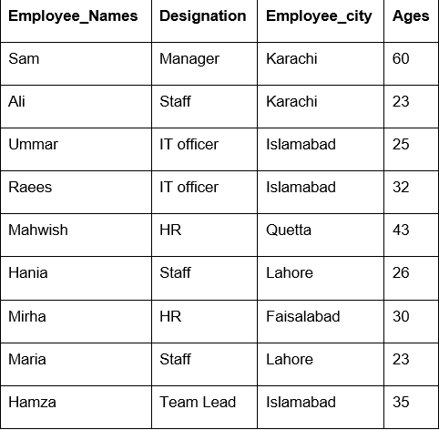 'Employee_city':['Karachi', 'Karachi', 'Islamabad', 'Islamabad', 'Quetta', 'Lahore', 'Faislabad', 'Lahore', 'Islamabad'],